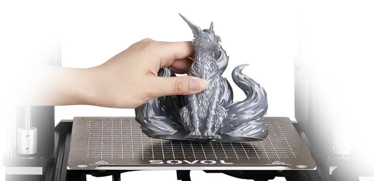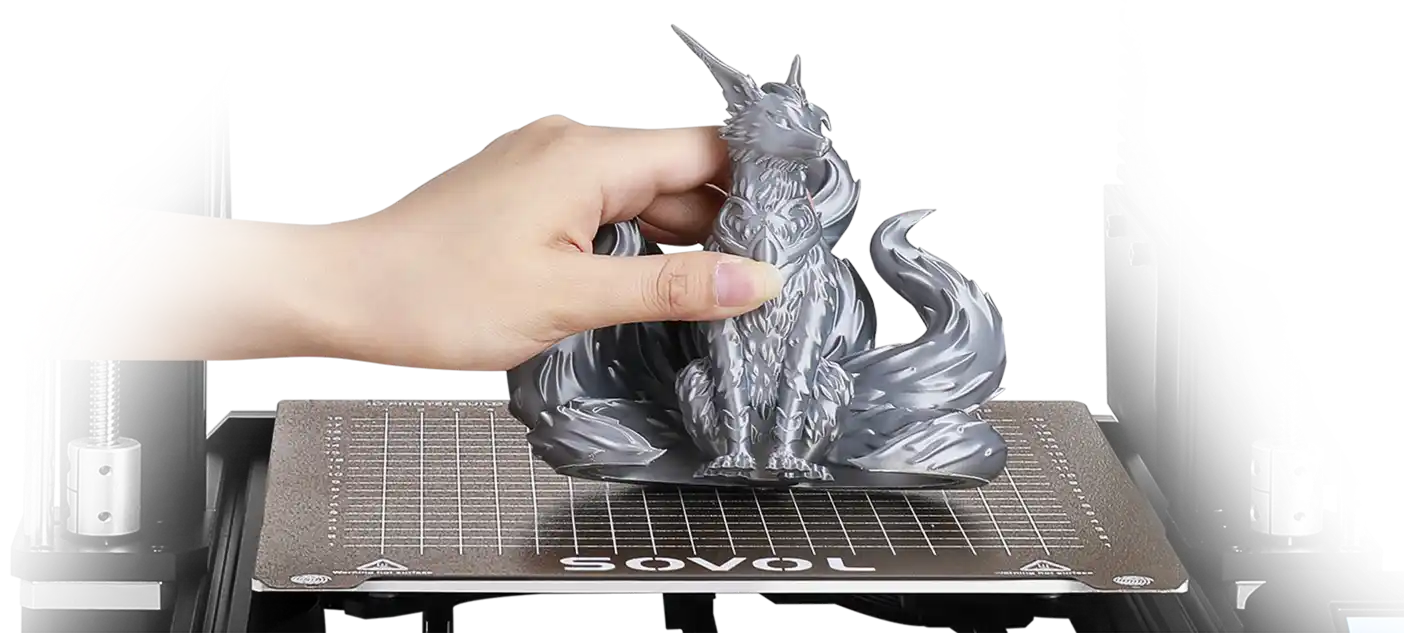 The PEI-coated Build Plate is flexible, the prints can be removed easily without any tools. The bed is solid, not easy to get scratches even in long-term printing.